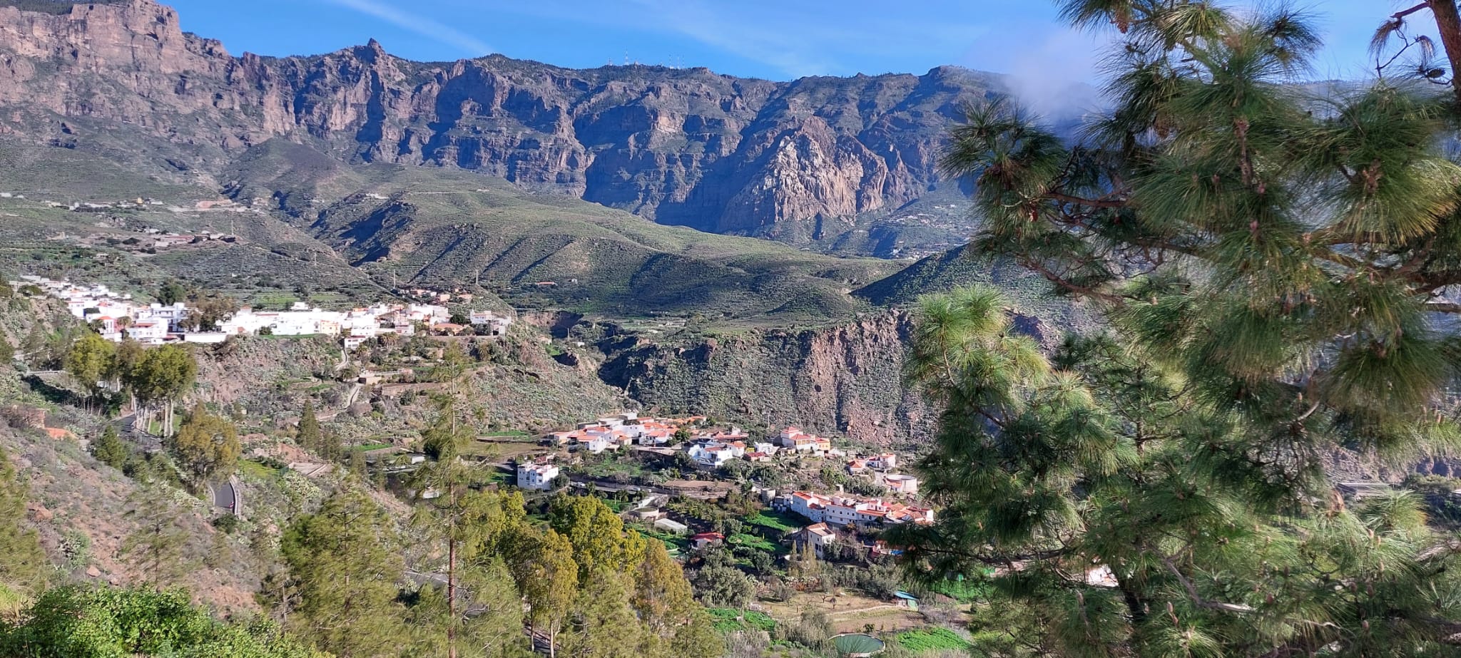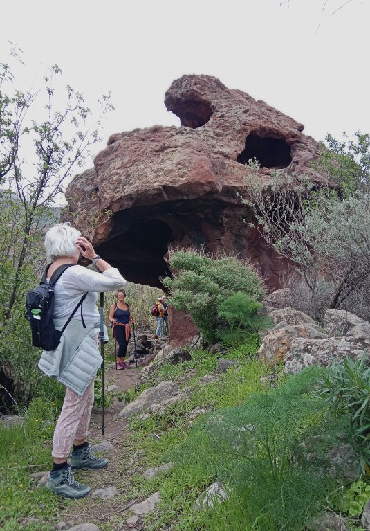 We liepen tussen de bomen, die door de regen van de laatste tijd mooi groen waren. Over de, af en toe smalle, paden vormde de groep een lange rij waarvan het einde soms niet te zien was. Af en toe moesten daarom stoppen om zeker te zijn dat iedereen nog wel aanwezig was. Het pad liep geleidelijk naar beneden richting Chira. Daar konden we genieten van prachtige uitzichten over de groene barranco met witte huisjes. We vonden ook al een paar amandelbomen waar de eerste bloemen begonnen te bloeien.. Dat belooft weer mooie plaatjes bij de volgende wandeling. Door de regenval van de laatste tijd stroomde er water onder in de barranco. Dit riviertje volgende we, onderwijl luisterend naar het stromende water. Het pad voerde door het riviertje via dikke keien. Iedereen slaagde erin om met droge voeten aan de overkant te komen.