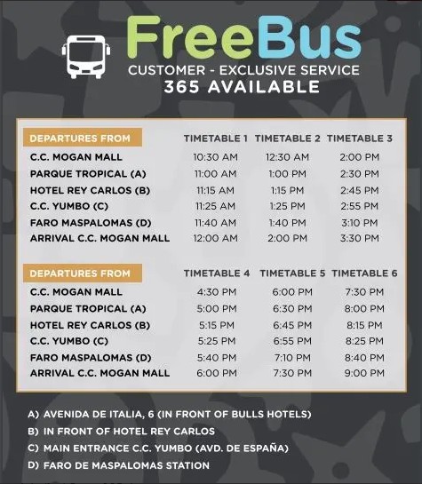Om naar het winkelcentrum te komen is een gratis busverbinding beschikbaar. Hiernaast ziet u de vertrektijden op verschillende haltes in Playa del Ingles en Meloneras, zowel voor de heen als de terugreis.