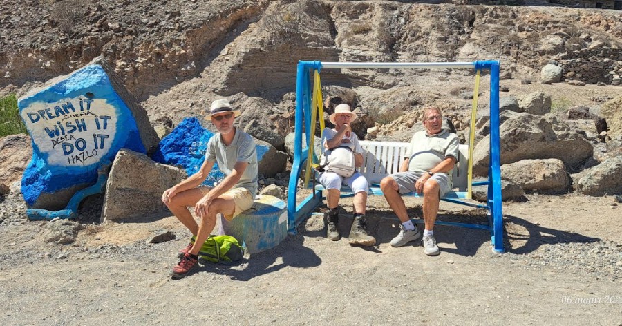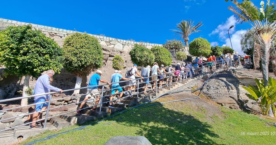 Vanaf 10.00 u. ontvangst bij een gelegenheid bij Playa de Arguineguín. Het eerste “winstpuntje” was …prima weer met een heerlijk fris ochtend briesje. Om 10.30 uur vertrokken we voorbij het (binnenzee) zwembad “piscina del Perchel” langs de kust, trappen op en boven langs kleine vissershuisjes en uitzicht over de haven.
