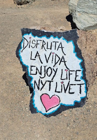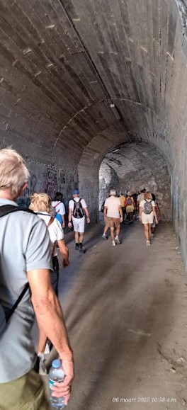 Zo gezegd en zo gedaan …Ook in tegengestelde richting kwamen we af en toe wandelaars tegen. Na de vele indrukken werd deze route al gauw de “blote buiken” route genoemd. Boven aangekomen werd gepauzeerd en hadden we uitzicht op een leuk bewoonde “grotwoning”, waarvan de bewoner(s) hun creativiteit duidelijk lieten zien. Er waren wat zitjes gemaakt, een schommelbank en stenen met allerlei spreuken.